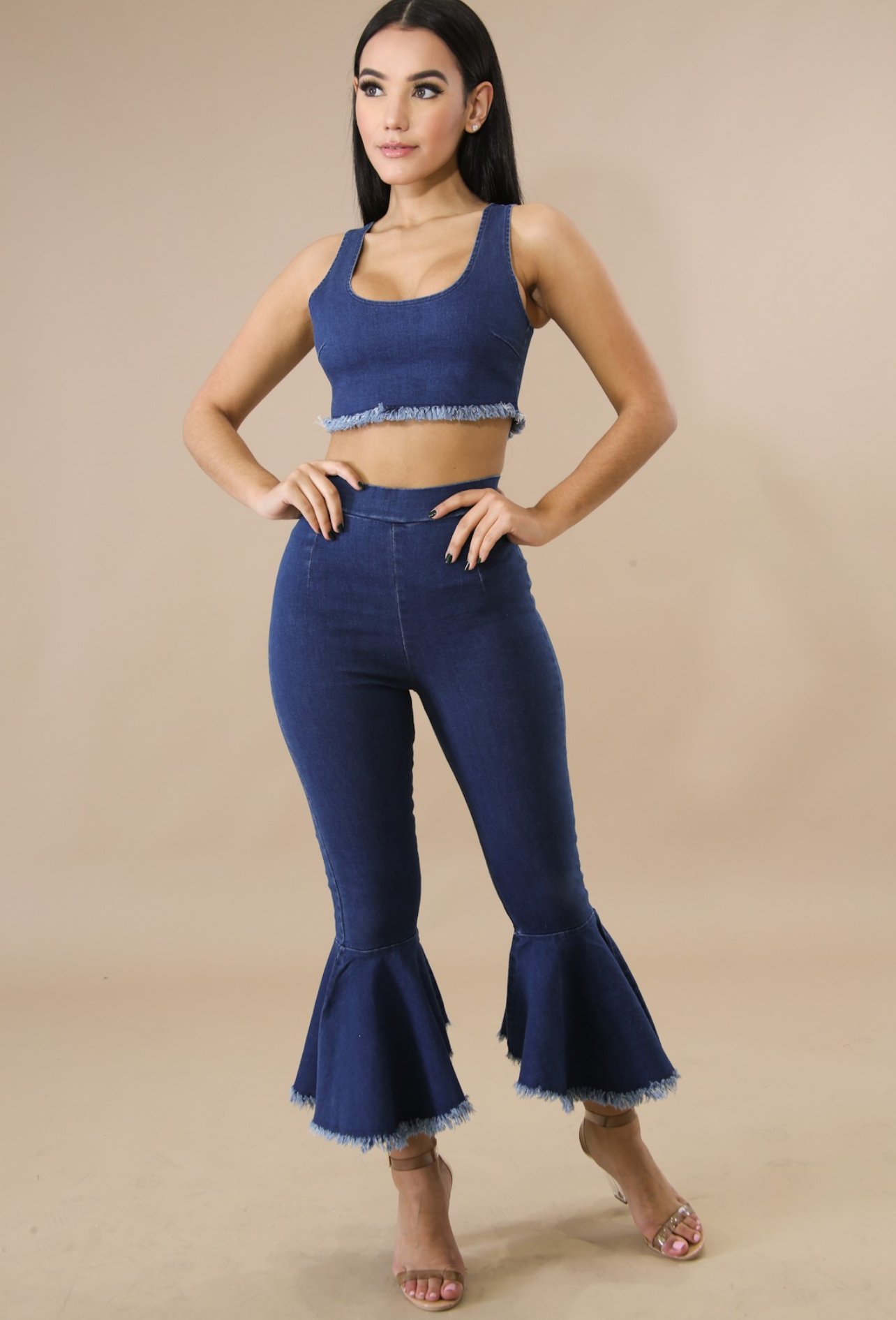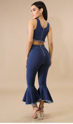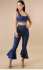 This shreds bell pant set features a stretchy fabric, crop top, shredded hemline, round neckline, back zipper closure, high waist pants stretch, bell bottoms, finished with a back zipper closure.