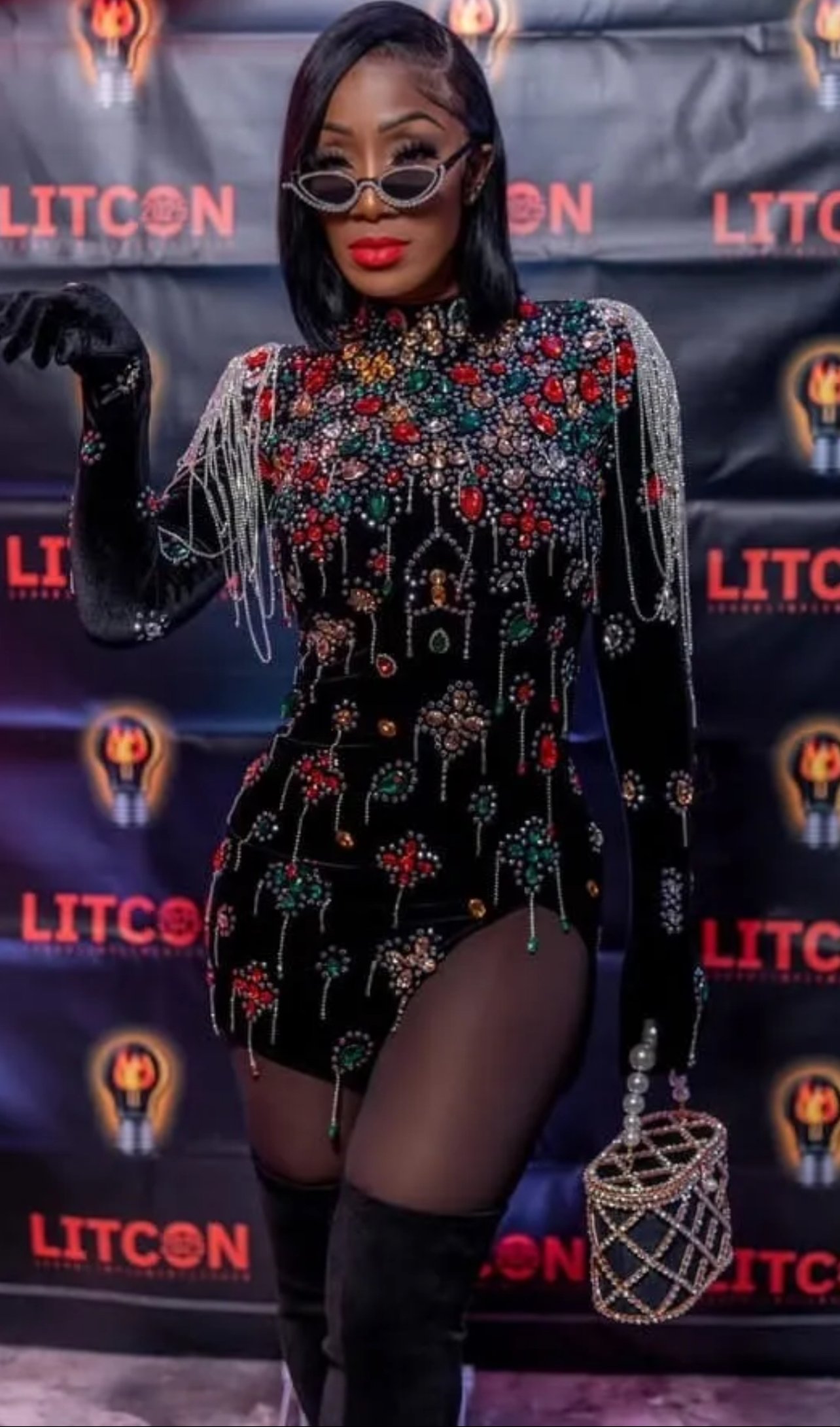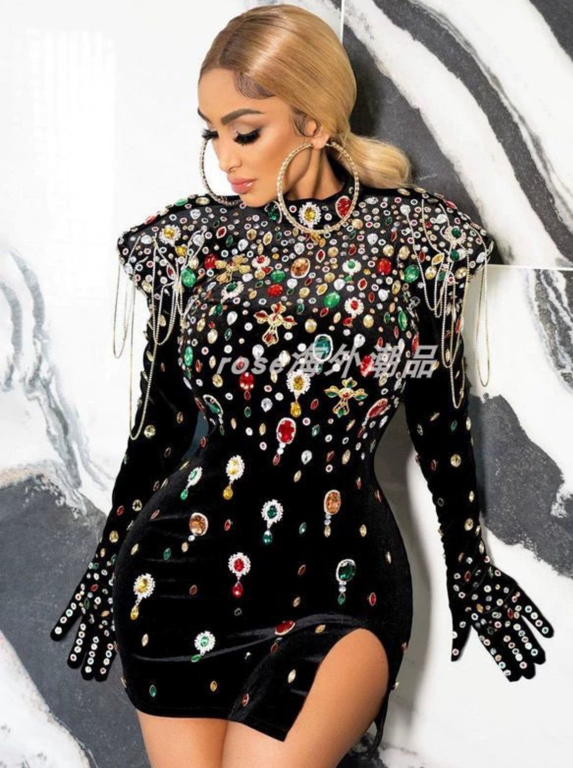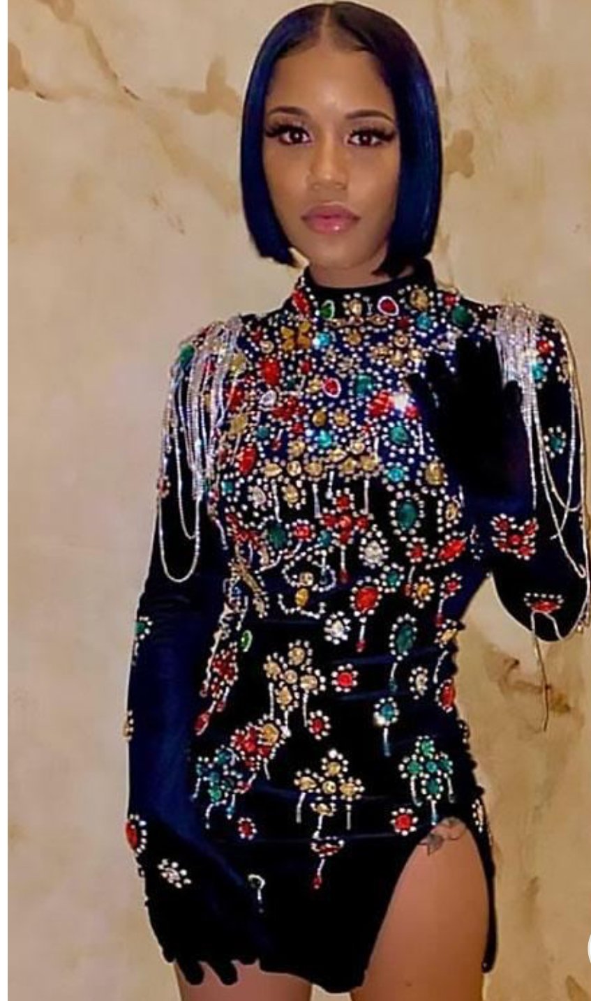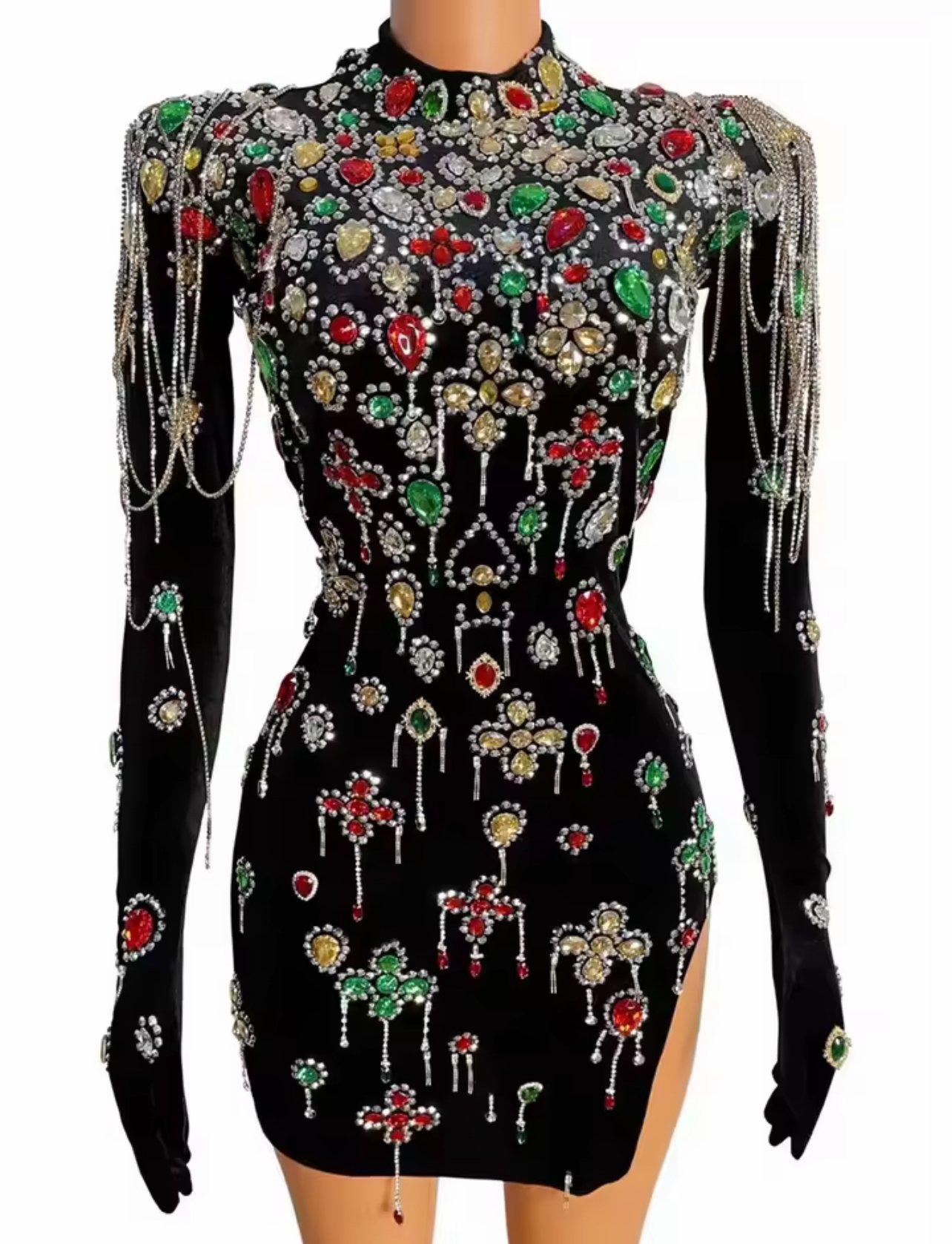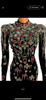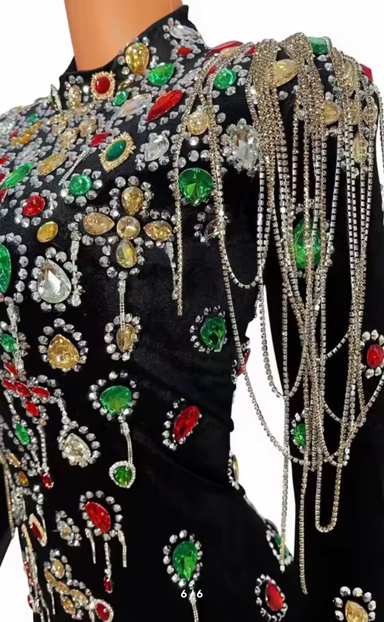 Step into elegance in this velvet fully adorned midi dress.. Each stone is hand placed perfectly. Hanging rhinestone chains to give it that super star feel.. Treat your self to this special piece today. This is a custom piece please allow up to 10 days for delivery.